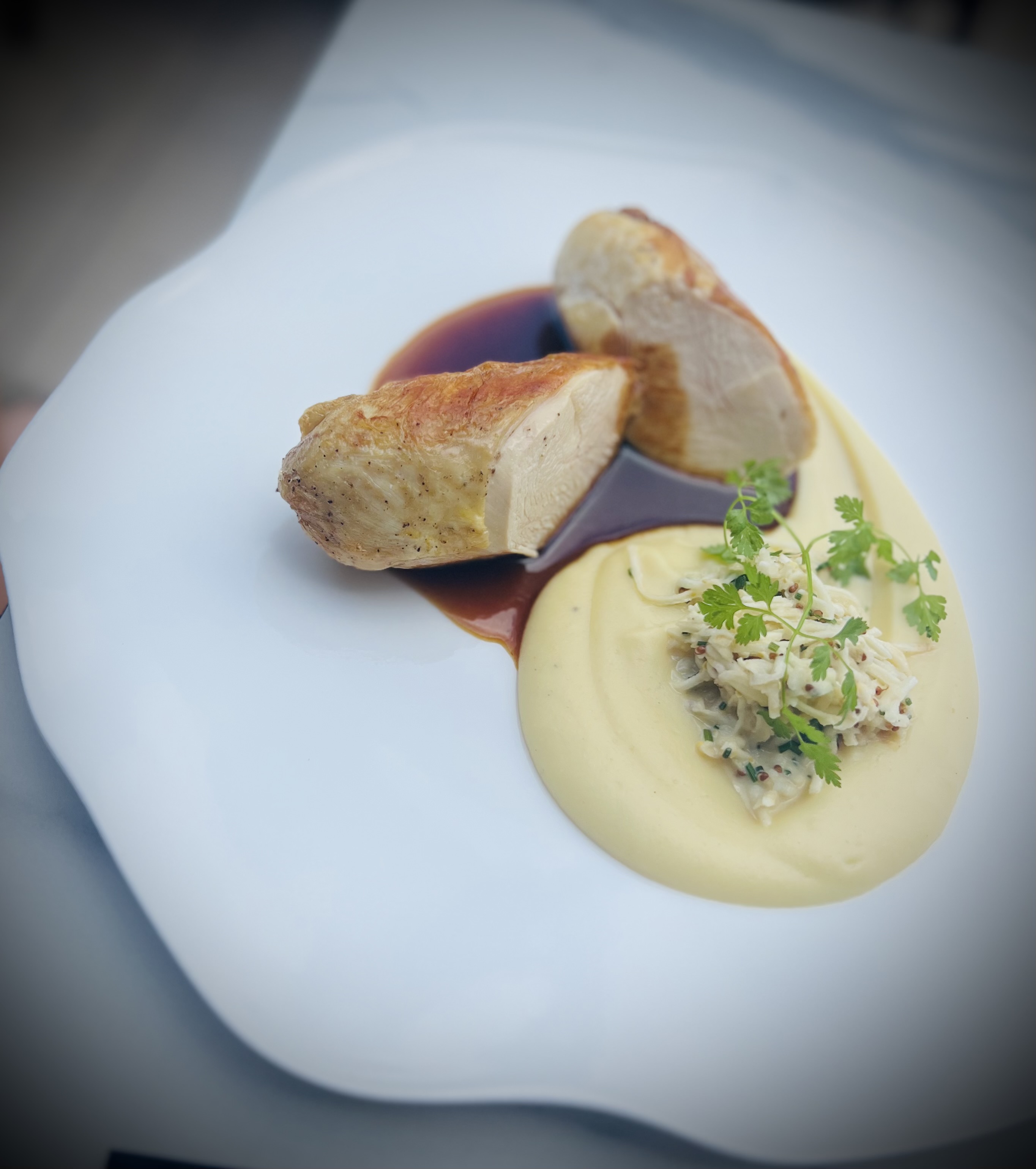La ballottine de volaille est sublime, bien que la peau manque d'une pointe de croustillance. Cette minuscule imperfection est vite oubliée grâce à l'assaisonnement maîtrisé.