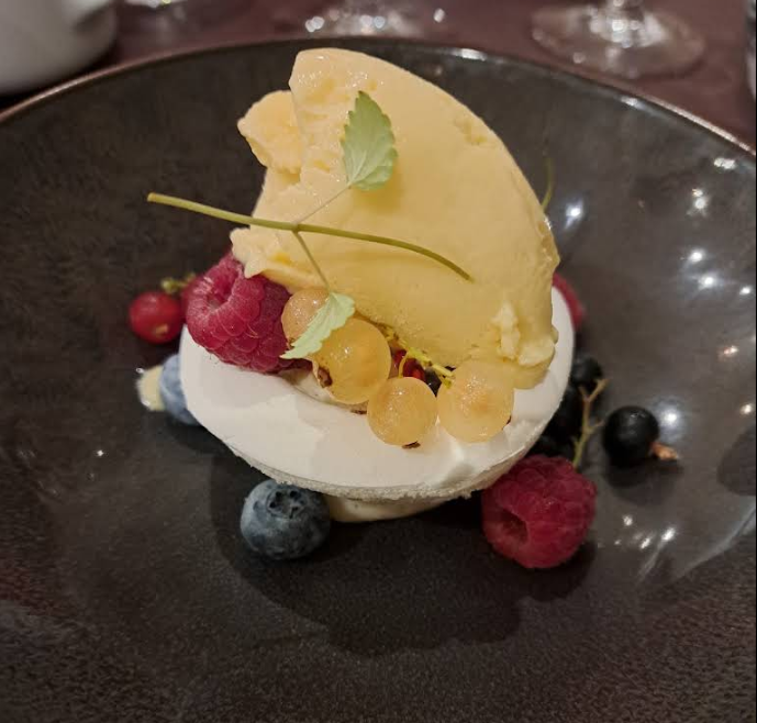 Viande – Travers de porc, légumes, pommes de terre lyonnaises, jus de viande Les travers sont fondants, savoureux, parfaitement assaisonnés. Le jus de viande est concentré, riche, soulignant avec générosité la viande et ses garnitures. Quelques cartilages perceptibles viennent troubler légèrement la dégustation, mais sans gâcher l’ensemble. Les légumes sont cuits avec soin, les pommes de terre à la lyonnaise sont moelleuses et parfumées. Une belle assiette de terroir, bien exécutée.