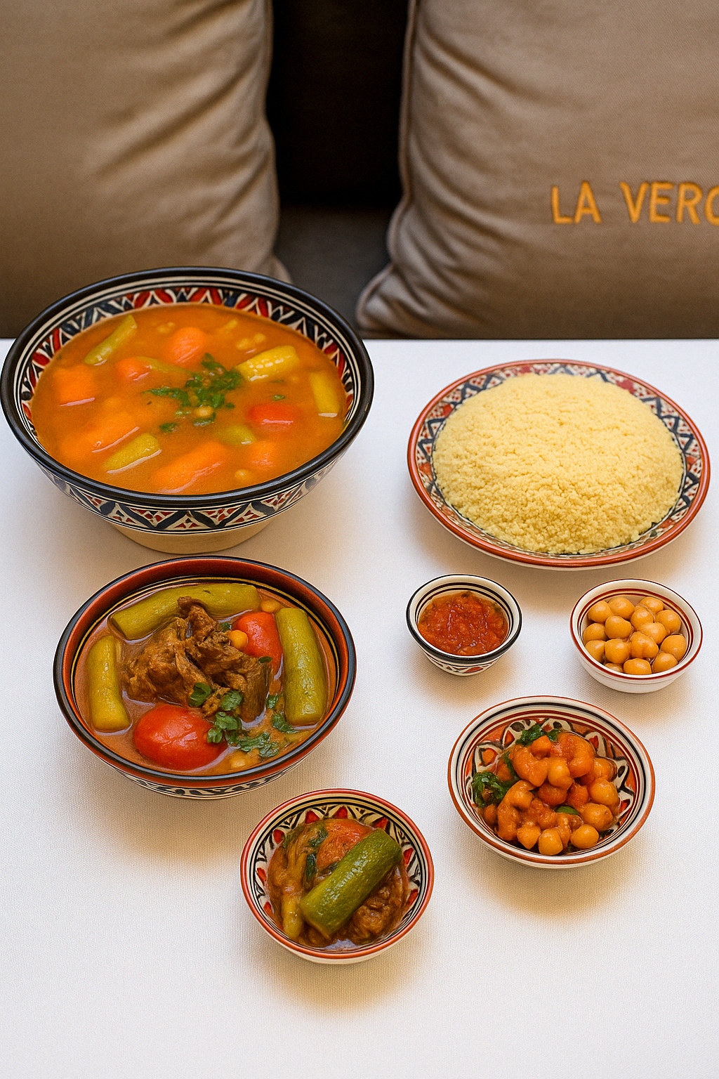 Une cuisine authentique et généreuse : Couscous, tajines, bricks, pastillas… chaque plat est préparé avec soin et amour, comme dans une maison de famille. Les épices sont parfaitement dosées, les cuissons maîtrisées, et les portions plus que généreuses. Mention spéciale au couscous royal : semoule légère, légumes fondants, viandes tendres et savoureuses – un vrai régal. Le tajine aux pruneaux et amandes, quant à lui, fond en bouche et embaume la table d’un parfum envoûtant.