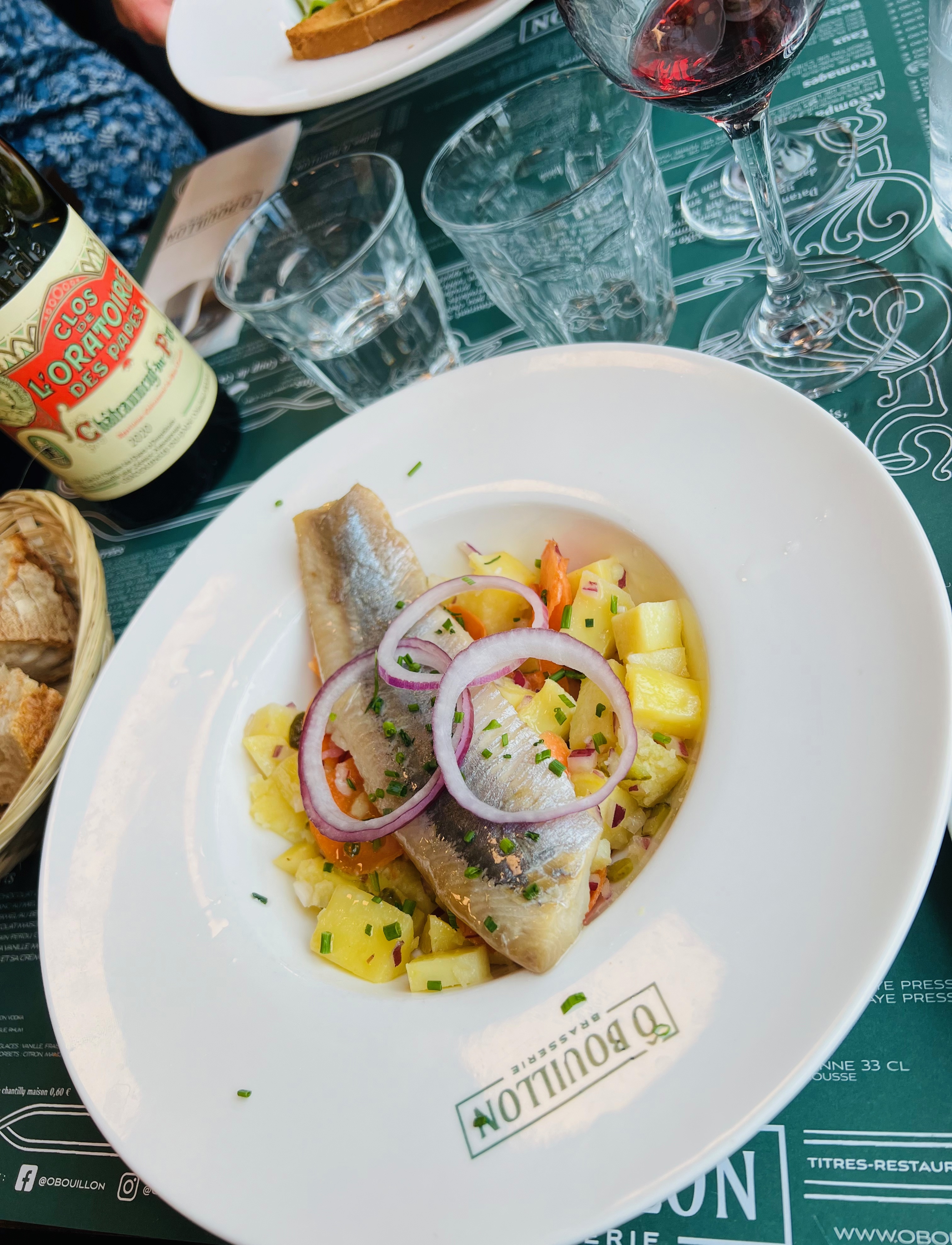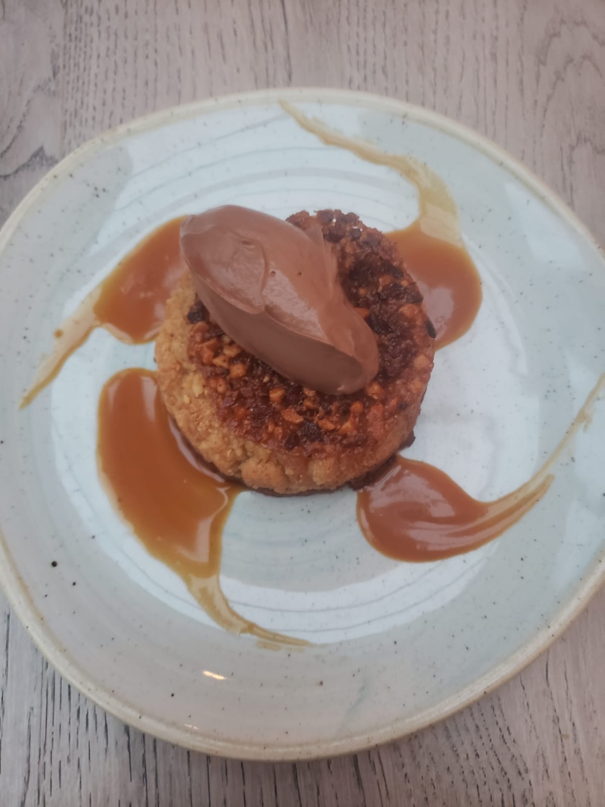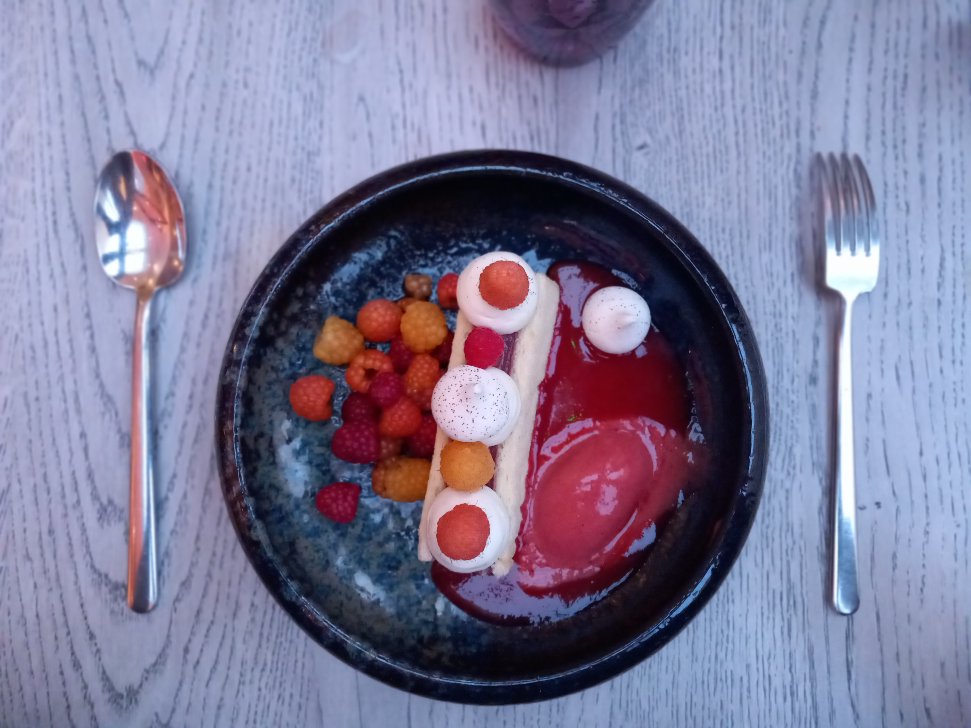 Viande – Travers de porc, légumes, pommes de terre lyonnaises, jus de viande Les travers sont fondants, savoureux, parfaitement assaisonnés. Le jus de viande est concentré, riche, soulignant avec générosité la viande et ses garnitures. Quelques cartilages perceptibles viennent troubler légèrement la dégustation, mais sans gâcher l’ensemble. Les légumes sont cuits avec soin, les pommes de terre à la lyonnaise sont moelleuses et parfumées. Une belle assiette de terroir, bien exécutée.