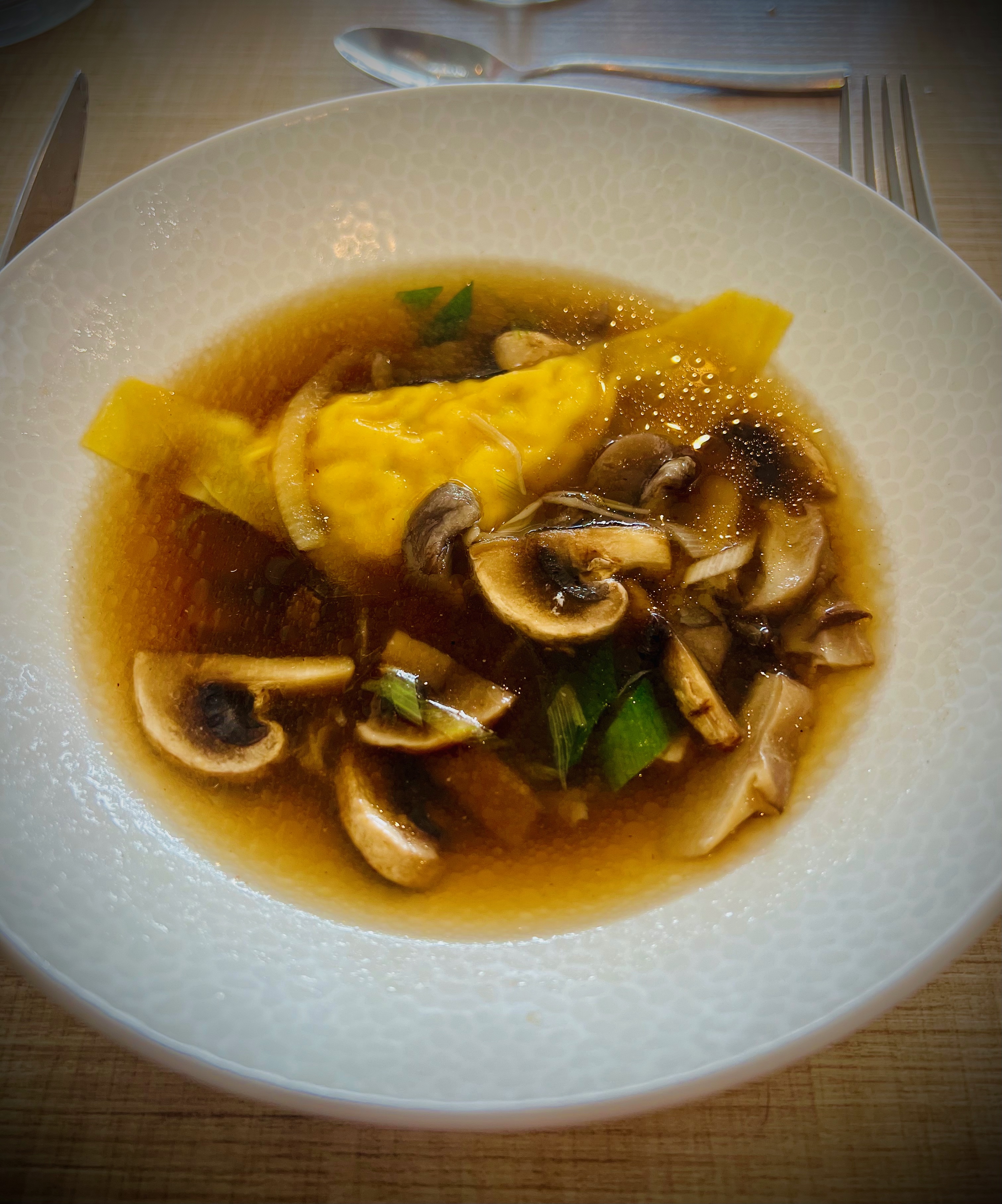 Entrée – Bouillon de volaille aux légumes et champignons Dès la première cuillère, le ton est donné : le bouillon est d’une grande pureté, limpide, concentré en saveurs sans jamais écraser le palais. Les légumes et champignons apportent une délicatesse végétale subtile. En option, les raviolis de poulet (supplément 3 €) ajoutent une gourmandise bienvenue, prolongent l’élan de la volaille avec une texture tendre et fondante. Une entrée tout en nuance, idéale pour ouvrir l’appétit.