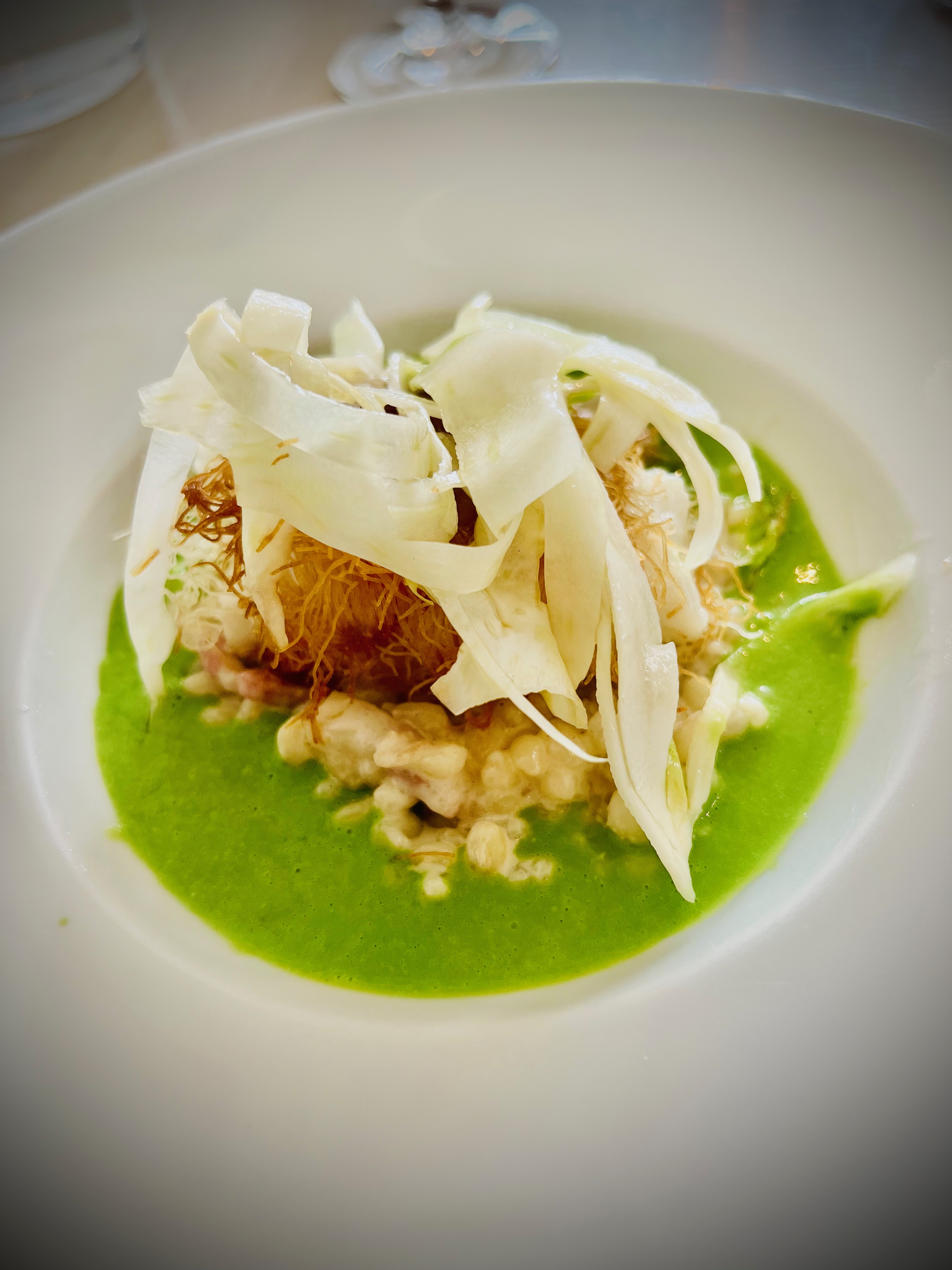 Poisson du jour – Églefin en kadaïf, risotto d’orge, fenouil et cresson Un plat remarquable tant sur le plan visuel que gustatif. Le filet d’églefin en croûte de kadaïf (cheveux d’ange croustillants) est une réussite absolue : doré, croustillant à l’extérieur, moelleux à cœur. Le risotto d’orge apporte une mâche originale et savoureuse, bien assaisonnée, pendant que la salade de fenouil rafraîchit l’ensemble. La sauce au cresson, fine et équilibrée, relie toutes les composantes avec élégance. Un plat signature, à n’en pas douter.