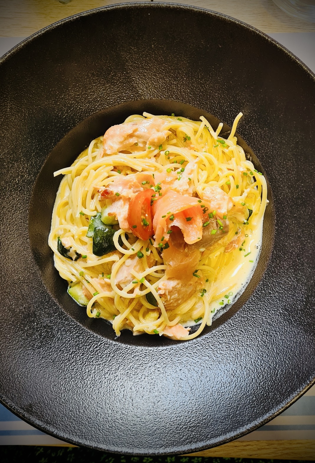 Cependant, le véritable triomphe de notre expérience gastronomique était le plat principal : des Tagliatelles alla vongole, mais pas n'importe lesquelles. Ces tagliatelles étaient revisitées à la façon normande, avec une généreuse portion de crème pour lier le tout. Cette touche crémeuse sublimait la persillade, créant une harmonie parfaite entre les saveurs marines des palourdes et la richesse de la crème.