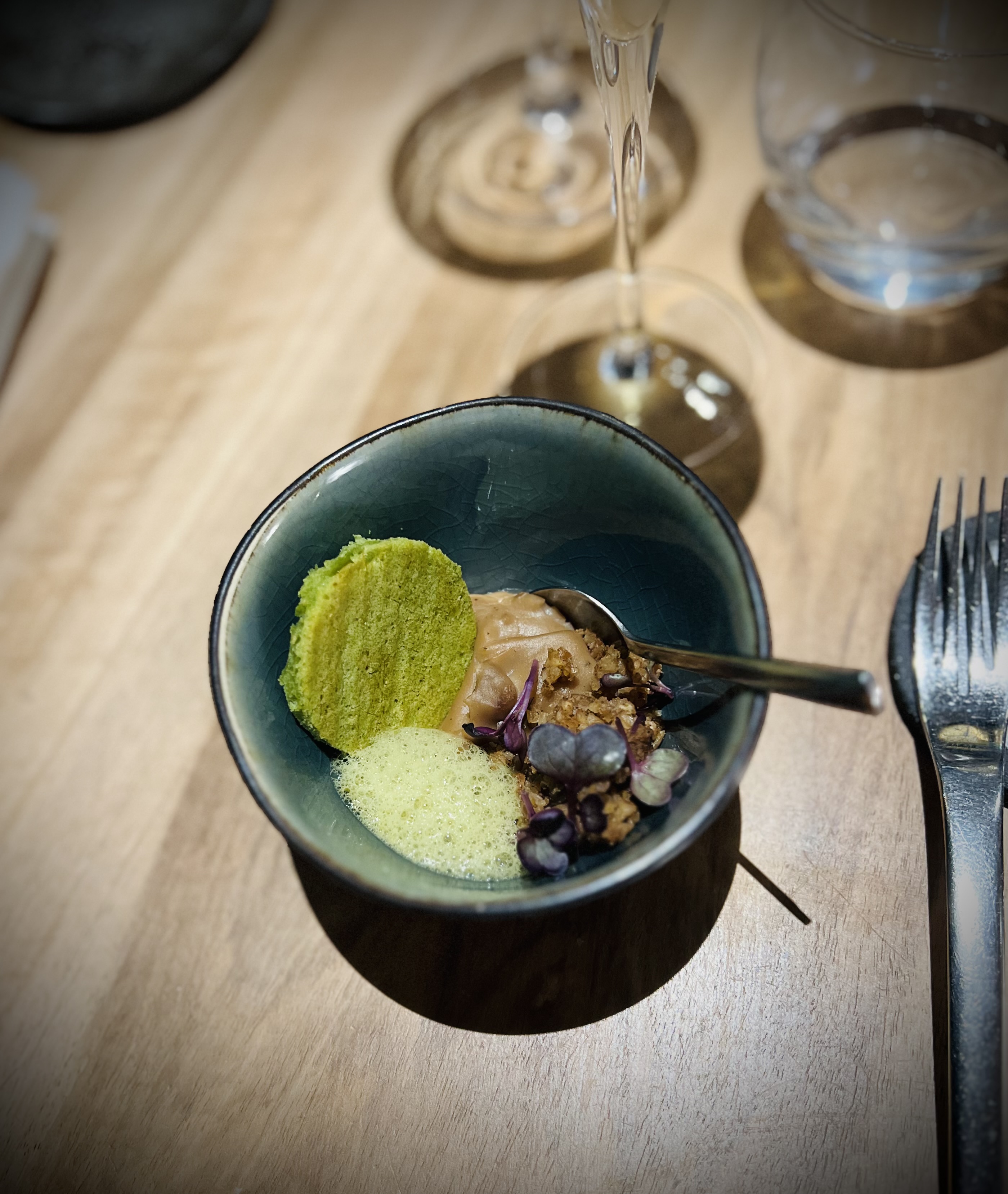 Pour les convives végétariens, le menu propose des plats tels que les carottes marinées avec céleri, pomme Grany, betterave, aneth et sarrasin, ou le potimarron confit et noisettes. Le fenouil au safran et la caillette de tofu, coriandre et épinards sont des options savoureuses et inventives.