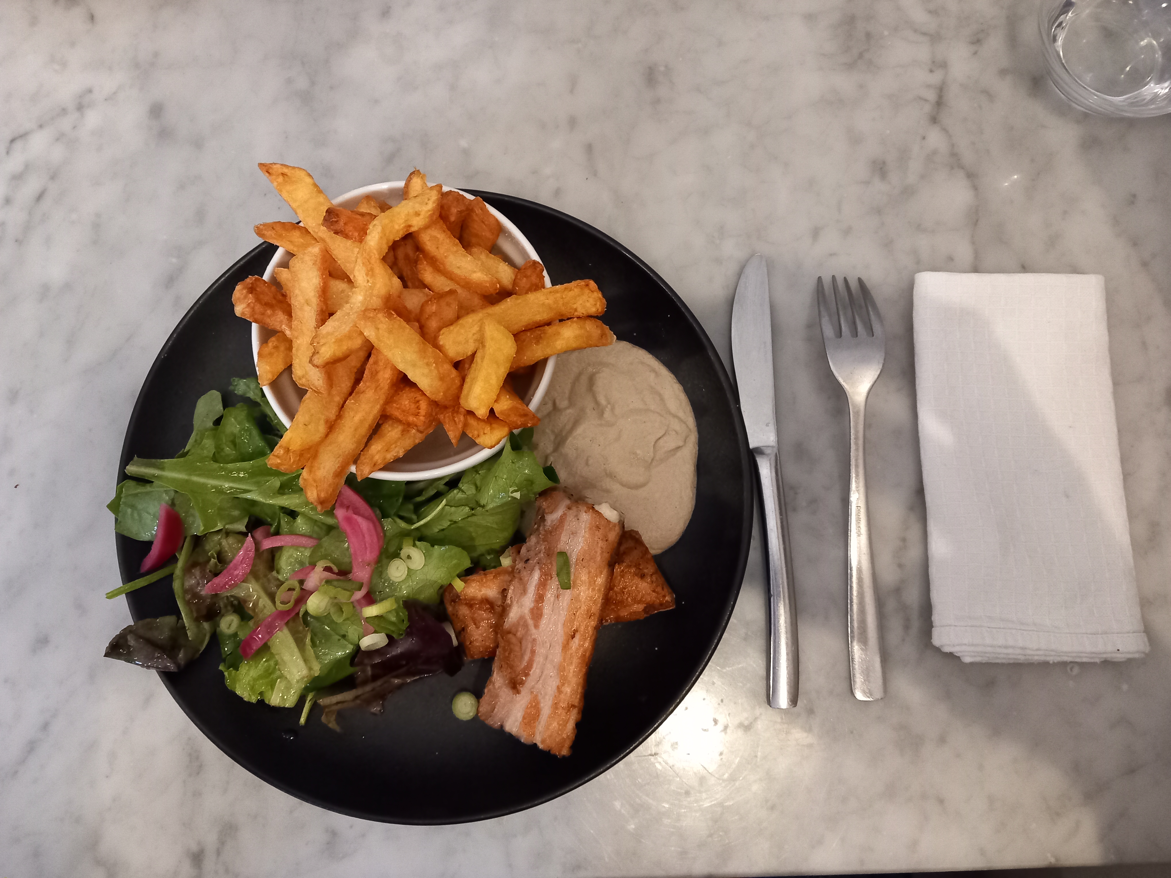 Commençons par l'aspect positif de notre visite : le service. Il convient de souligner le professionnalisme du personnel de salle. Le serveur qui nous a accueillis était non seulement agréable mais aussi remarquablement rapide et efficace. Il a su faire preuve d'un excellent sens du timing, répondant promptement à nos demandes et anticipant même certains de nos besoins. Sa présence discrète mais attentive a contribué à instaurer une atmosphère détendue, transformant notre repas en une expérience plaisante sur le plan du service.